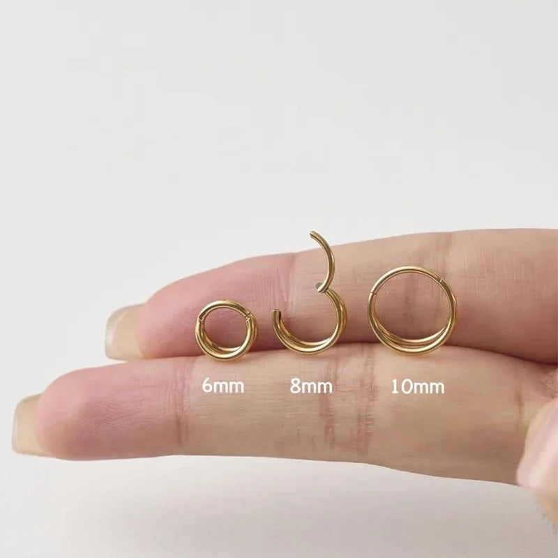 Inspirée de la boucle d'oreille anneau femme, cette pièce joue sur la superposition pour créer un effet visuel raffiné. Le double cercle donne de la profondeur à votre composition d’oreille. Ce piercing s’intègre facilement à d’autres bijoux pour un look harmonieux.